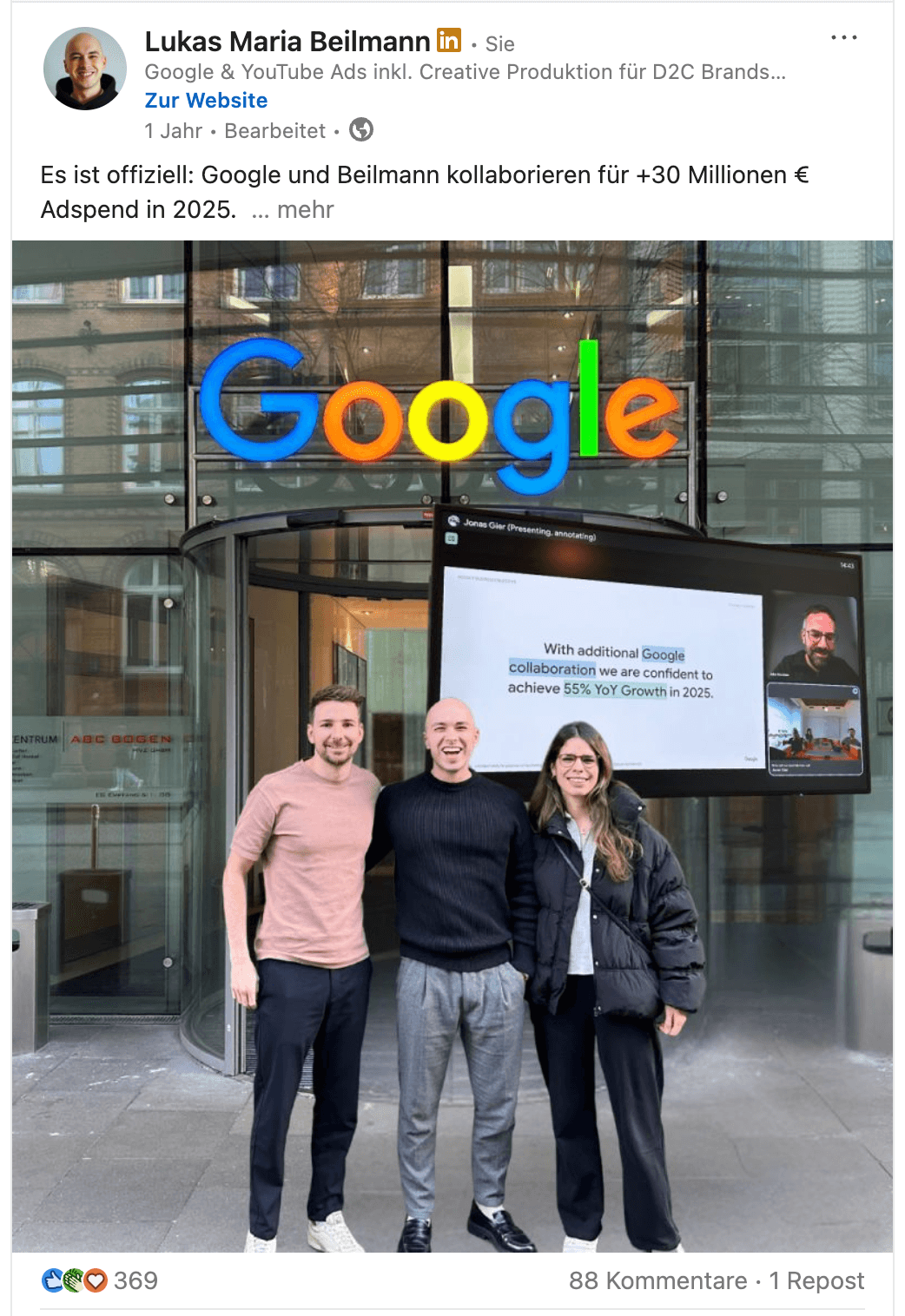Wir freuen uns sehr, Teil des Google Premier Programms in DACH zu sein. Bekommt man dieses Badge, zählt man zu den Top 3 % Google Ads Agenturen in DACH (laut Google). hier findest du mehr Infos dazu: https://www.google.com/partners/agency?id=2839518922 Zusätzlich sind wir in einem speziellen Partner Programm mit Google, das uns nochmal neue Möglichkeiten eröffnet. Wir haben dadurch Zugriff auf neue Feature, regelmäßige Calls direkt mit Google-Specialists und quartalsweise Treffen, um noch mehr aus unseren Kunden-Accounts rausholen zu können. Hier haben wir (Lukas Beilmann) auch schonmal auf LinkedIn dazu gepostet: https://www.linkedin.com/posts/lukas-maria-beilmann_es-ist-offiziell-google-und-beilmann-kollaborieren-activity-7293547123441061888-ZJT9?utm_source=share&utm_medium=member_desktop&rcm=ACoAACmnuVkBxs4iLsYfPRQQQCaWnafJqcVoW9w